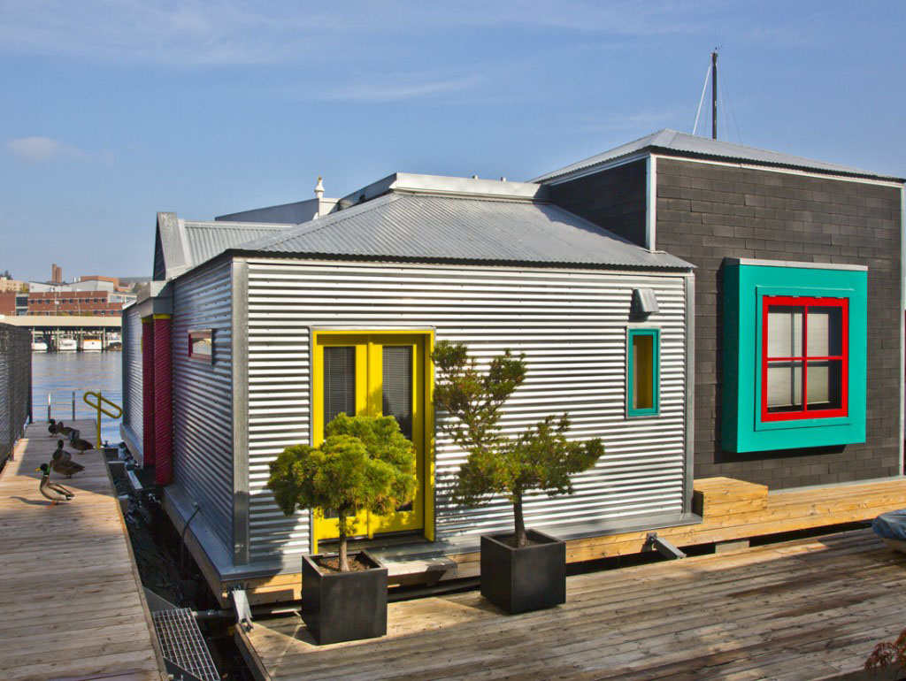 This chic houseboat on Portage Bay in Seattle, Washington enjoys expansive views while floating on Lake Union.