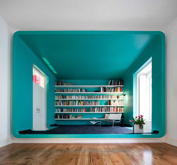 GMG House in Torres Vedras, Portugal designed by Pedro Gadanho is a 400-square-meter renovated townhouse in a 19th century building. The vibrant theatrical colors paints the structure in dramatic, playful angles and shapes. A bright turquoise dominates the stairs and the reading room. Yellow, red and purple provide striking contrast to the space.