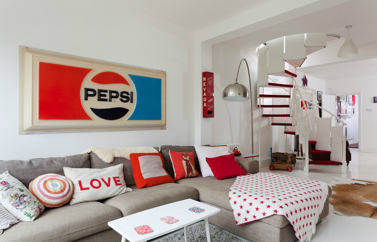 This simple family home in Ravenscourt, London, England has been decorated with a simple red and white theme with a retro touch. The eclectic decor provides a sense of quirkiness that feels both homey and stylish.
