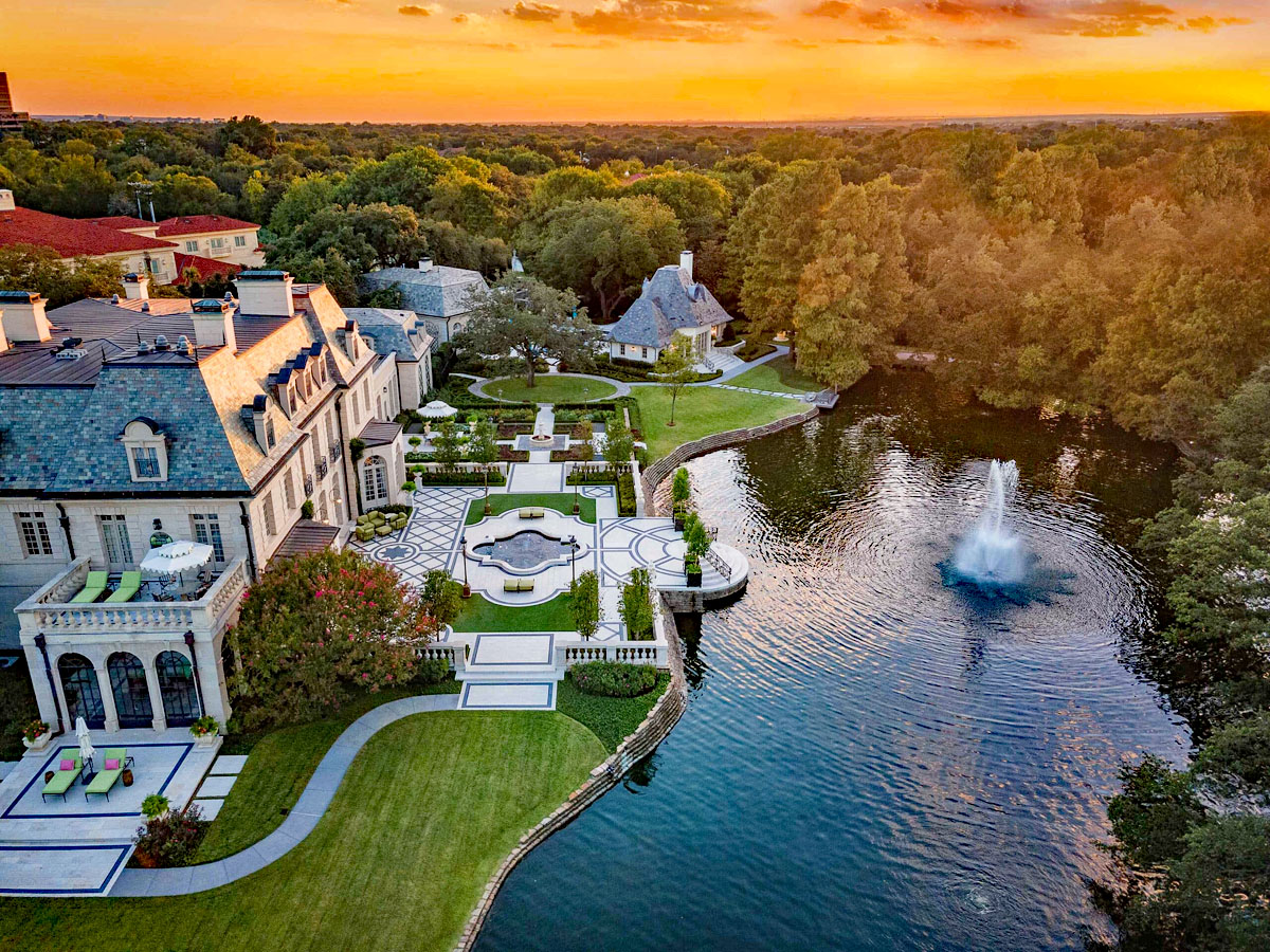 This iconic European-style estate in Dallas, Texas underwent a comprehensive exterior renovation which features stunning manicured gardens and a serene lakeside backyard oasis.