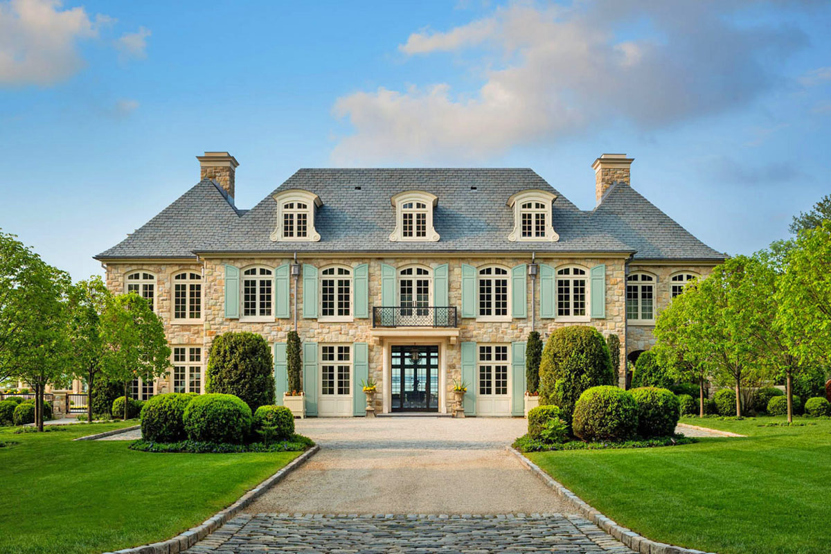 This exquisite residence in Greenwich, Connecticut is anchored with native fieldstone and limestone while incorporating French elements such as flared roofs, arched dormers, intricate iron railings and balconies.