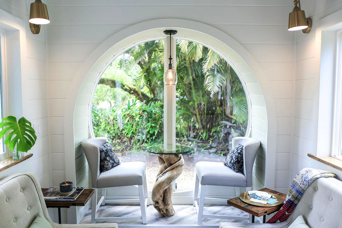 This cozy luxury tiny home in Maui, Hawaii features an eye-catching circular window on one end and a round skylight above the shower at the other end.