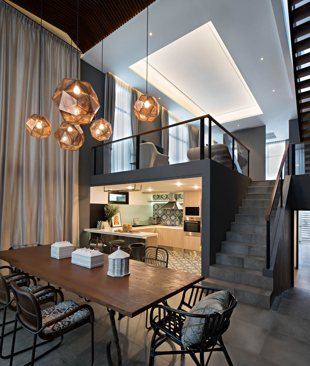 Cideng House in Jakarta, Indonesia is a unique residence with a loft family room above the kitchen. The mezzanine floor makes this house appear edgier. An open dining area with high ceiling makes the main floor feel more spacious.