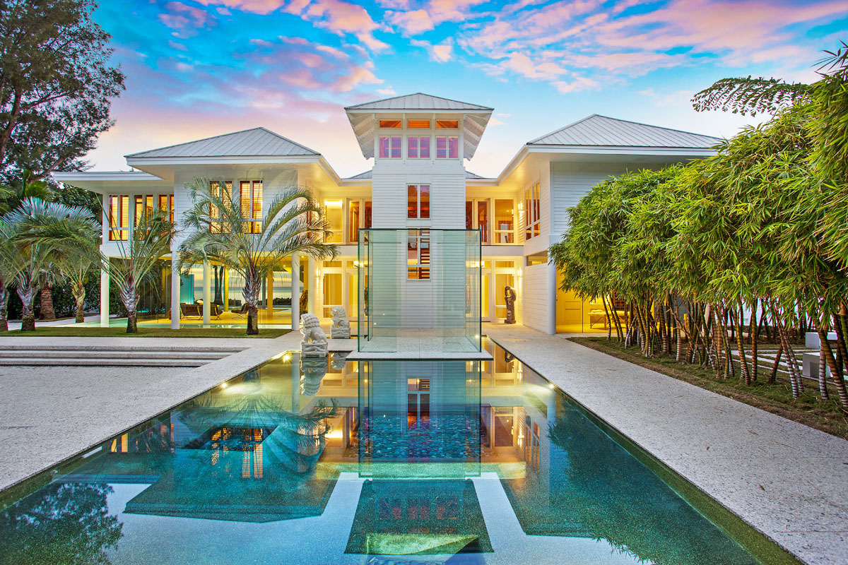 An updated design of this modern estate in Siesta Key, Florida created an oceanfront sanctuary framed by water features and palm trees.