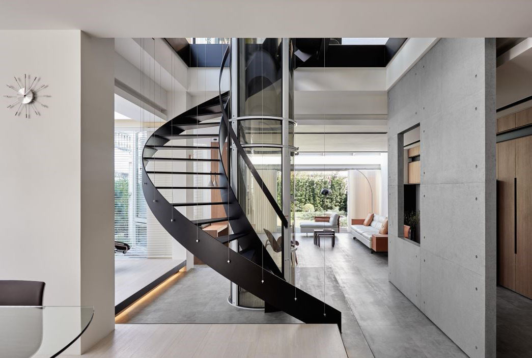 This unique multi-level modern home in Taipei City, Taiwan is visually dominated by a glass elevator with a spiral staircase wrapped around it on every floor.