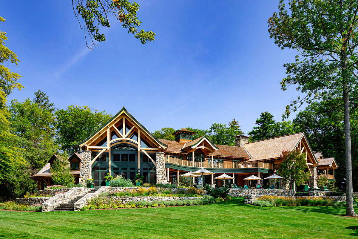 Located on the banks of Lake Winnipesaukee in Wolfeboro, New Hampshire, this resort-like lodge is an elegant lakeside retreat with a rustic tone. The south facing 20,000-plus-square-foot home on Tips Cove includes a timber frame main house and a boathouse.