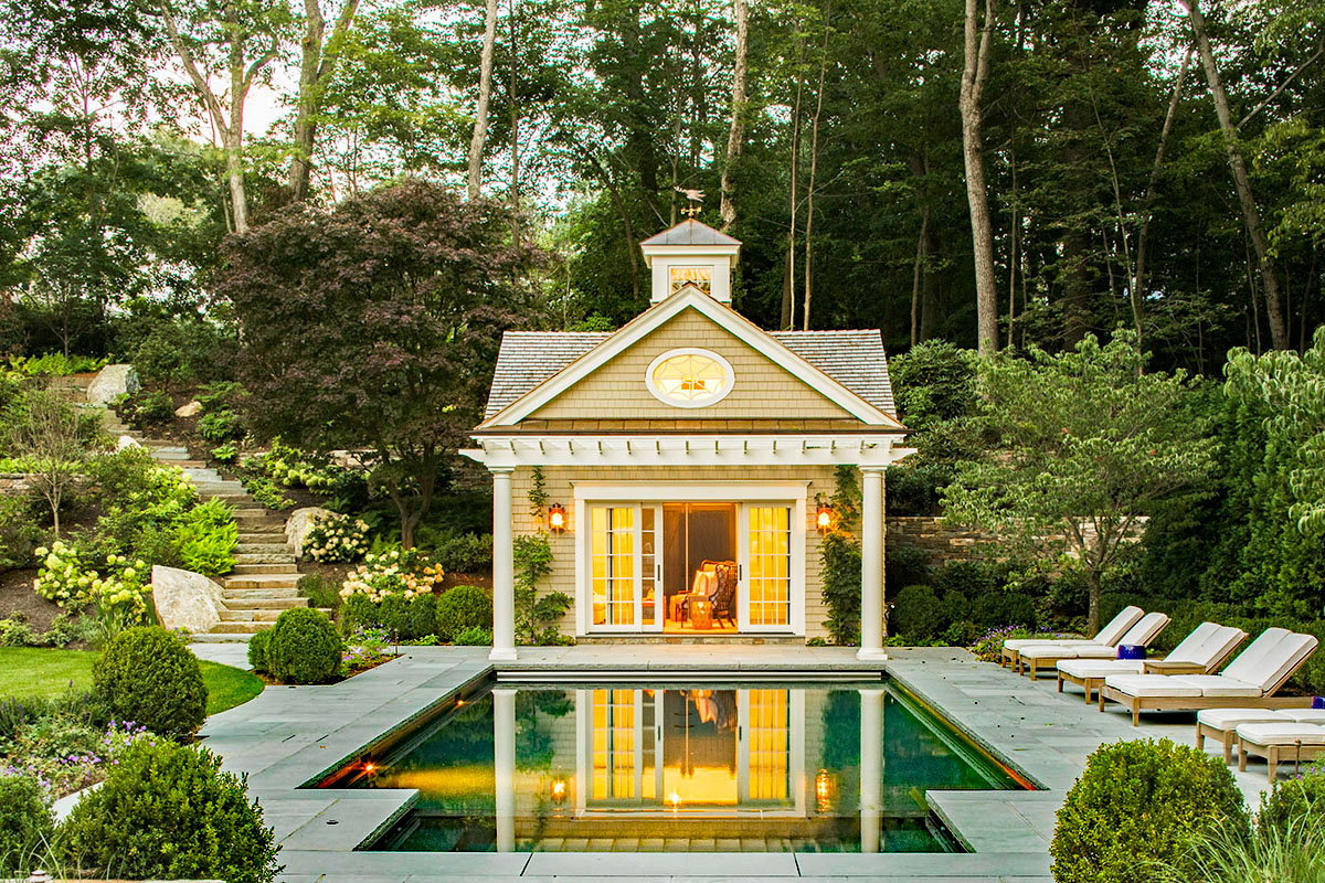 This elegant pool house in Dover, Massachusetts designed by Patrick Ahearn Architect is a simple white-painted clapboard building that recalls New England’s classic farmhouse architecture.