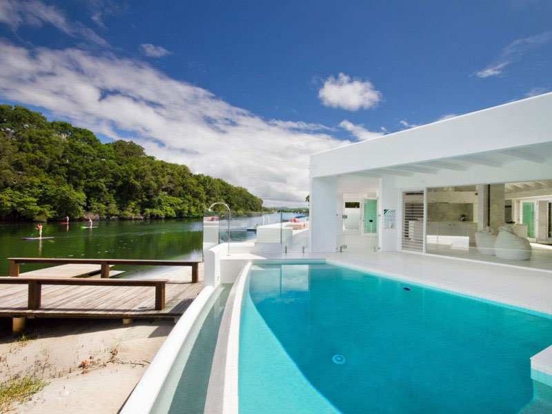 Set on prime river frontage in Noosa Sound, Queensland, on the Gold Coast of Australia, this first class modern home was inspired by Ralph Lauren’s Caribbean holiday home. The white clean lines and expansive living areas allow cool breeze to flow through the house. Every room has access to the outside living areas. The open plan home design with high end appliances and luxurious fittings provide the ultimate modern living in a casual sunny setting.