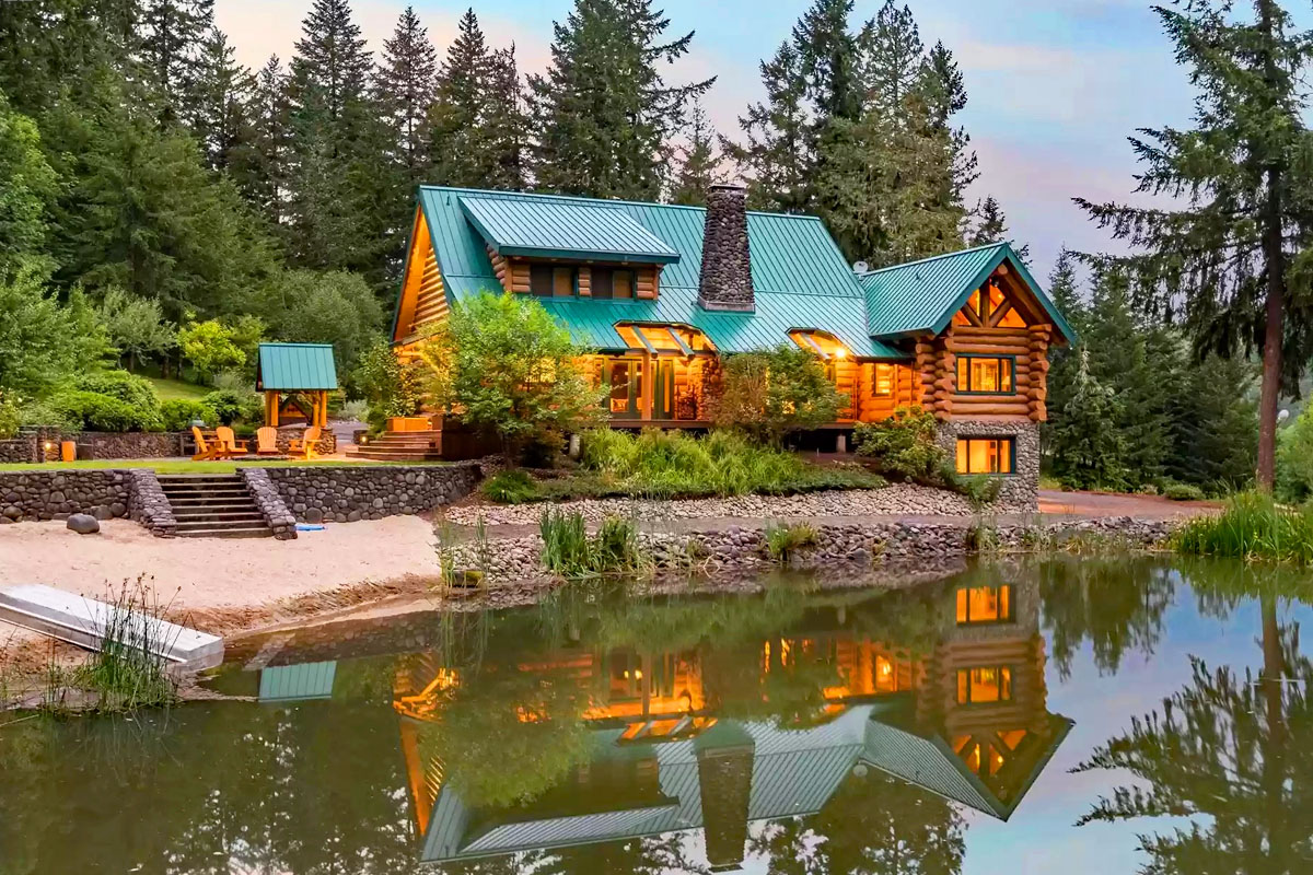 This luxurious log home in Eugene, Oregon is nestled on 160 wooded acres with soaring trees. From the main gate, the driveway winds past meadow through meticulous landscaping to the main house by a natural pond.