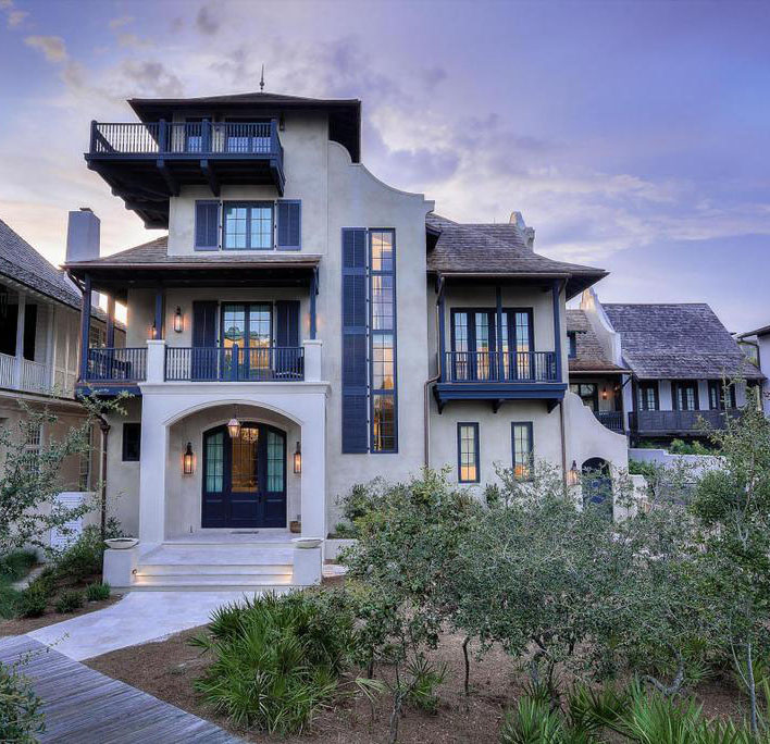 Barrett Place in Rosemary Beach, Florida is a commercial and mixed-use property featuring a solid stucco-on-masonry design with timber-framed porches, reflecting the town’s signature architectural style.