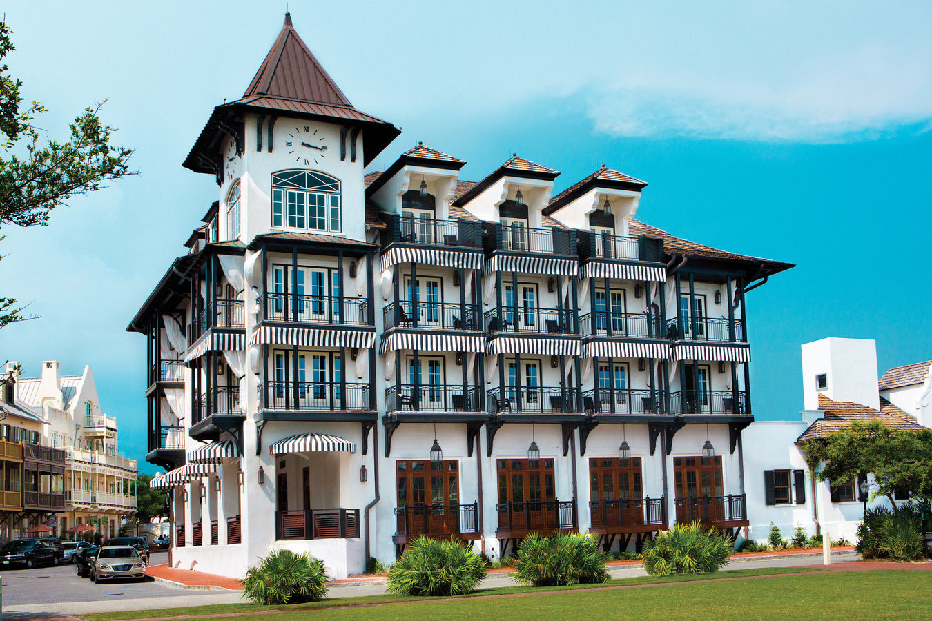 The Pearl Hotel is a boutique hotel in Rosemary Beach, Florida with distinctive Old World European architecture and timeless black-and-white striped awnings.