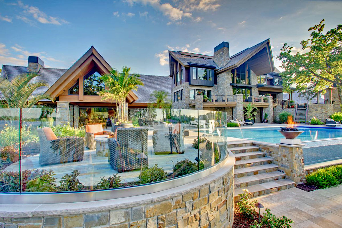 Perched atop a picturesque knoll in Palmer Pointe, Minnetrista, Minnesota, this striking stone-clad residence offers breathtaking views of Lake Minnetonka.
