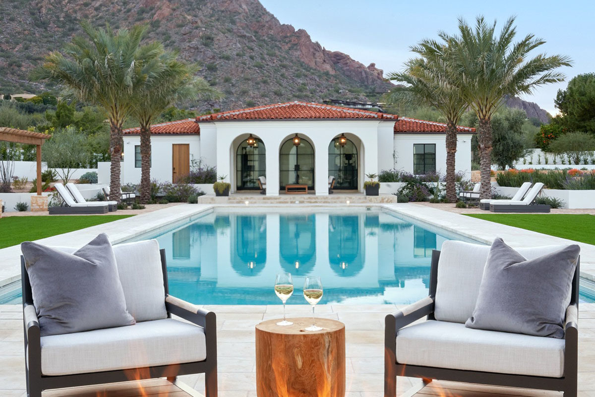 As you step through the grand carved-wood doors of this Spanish Colonial style home in Paradise Valley, Arizona, you are greeted by a pair of century-old olive trees and a courtyard that is centered around a bubbling stone fountain. The view extends through the house to a private botanical garden against the backdrop of the Camelback Mountain.