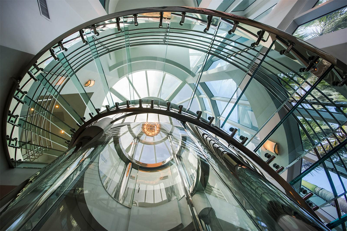 This luxury waterfront home in St. Petersburg, Florida is a unique custom built residence with a seven-foot-in-diameter round glass elevator at the centre of its interior. A glass spiral staircase wraps around the three-story circular elevator that reaches to the skylight above.