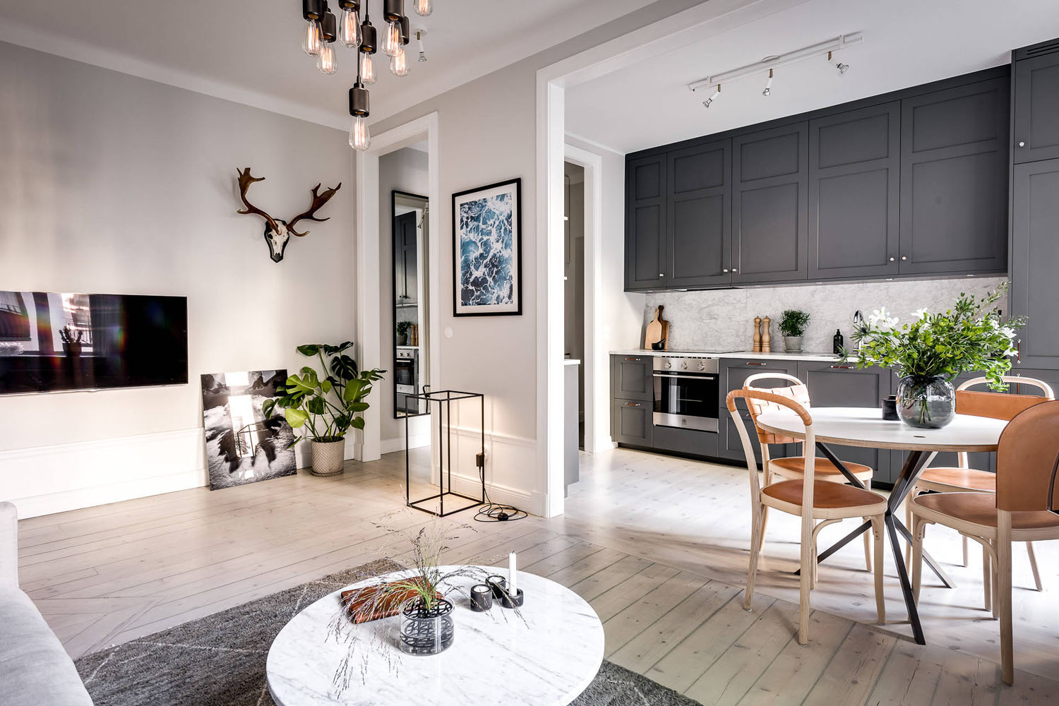 This 613 sq. ft. renovated one-bedroom apartment in Stockholm, Sweden has a spacious feel and harmonious modern decor.
