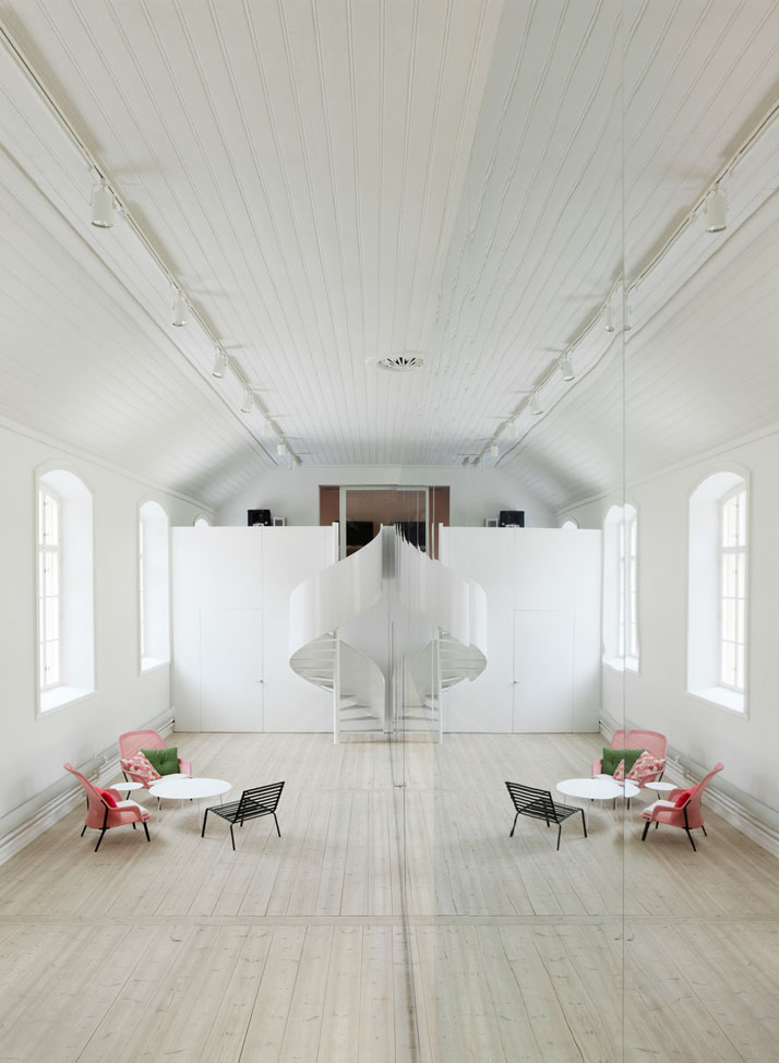 The modern interior design of consulting firm No Picnic in Stockholm, Sweden has a simple yet creative atmosphere. Swedish architect Elding Oscarson use reflective aluminum walls to make the space appear bigger.