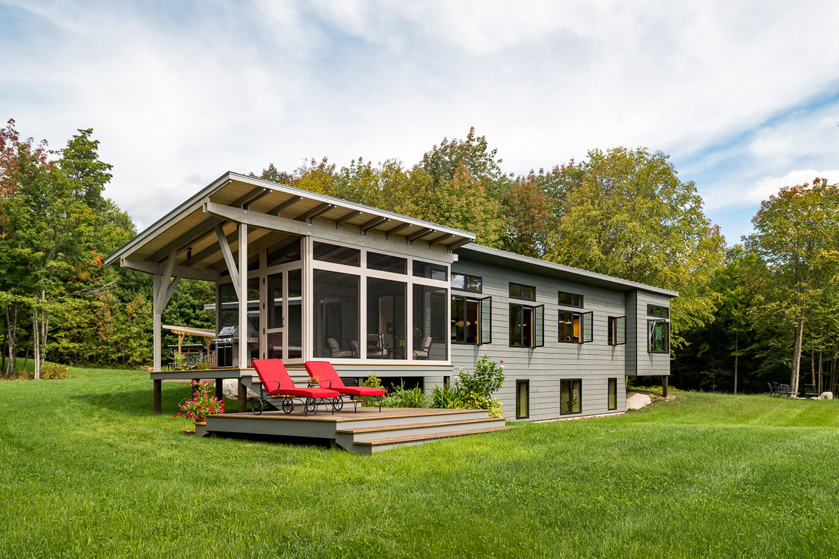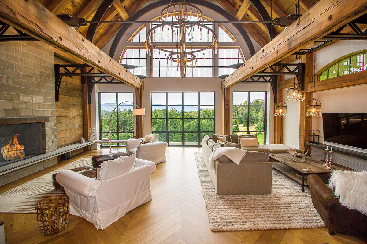 Situated in a serene country setting, this custom home in Stratton, Vermont is a shingles and steel house with a harmonious mix between coastal exterior architecture and rustic modern industrial interior.