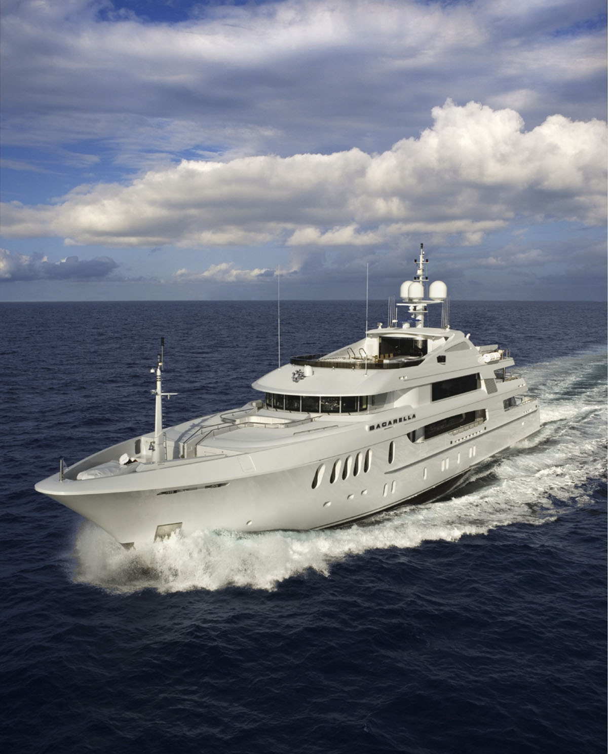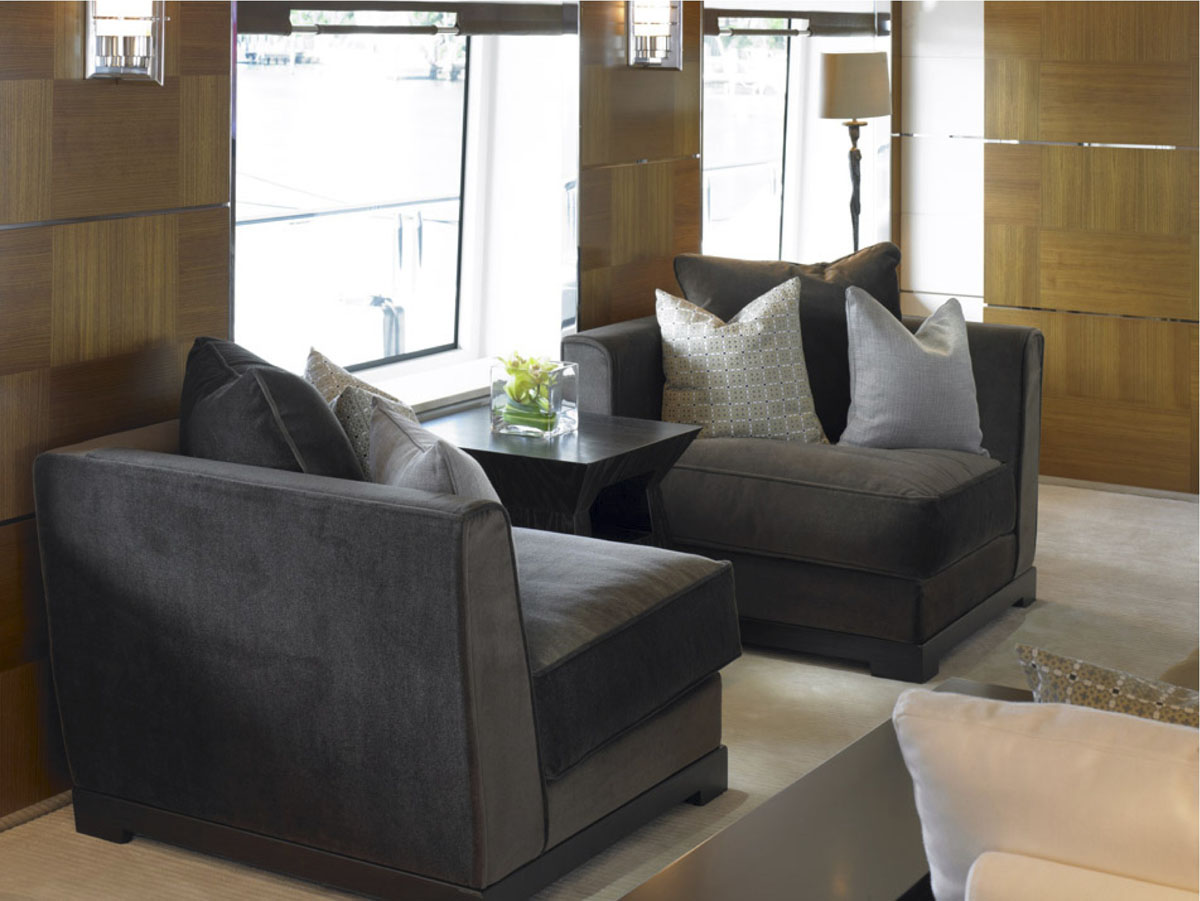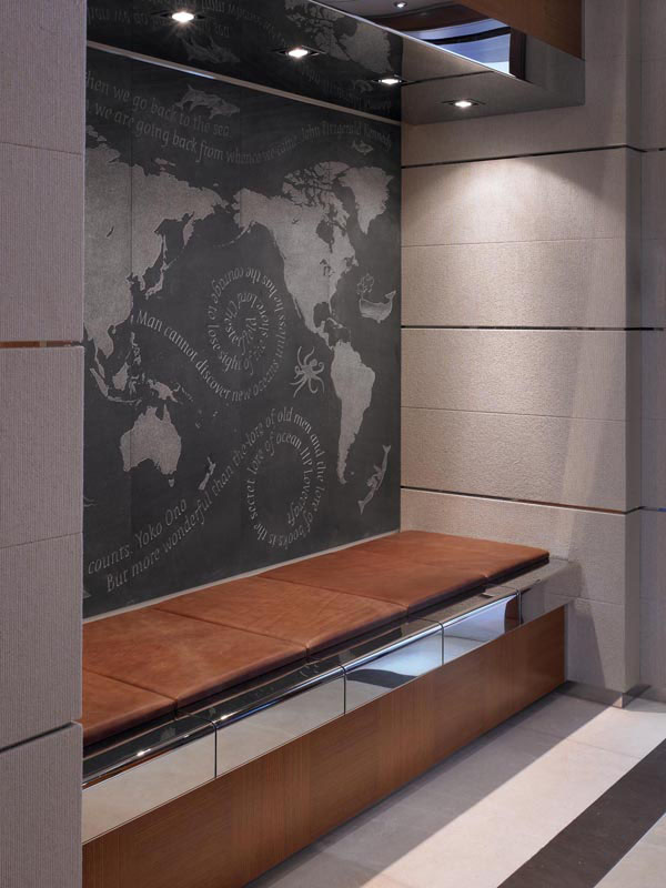Trinity’s 196 foot “Bacarella” has a California-style interior by Bannenberg & Rowell Design that is laid-back yet sophisticated. A palette of unusual materials and pale colours are used such as the textures of limestone and slate, bronze and grain of elm. The design is both dramatic and soothing, seemingly simple yet intricately detailed.