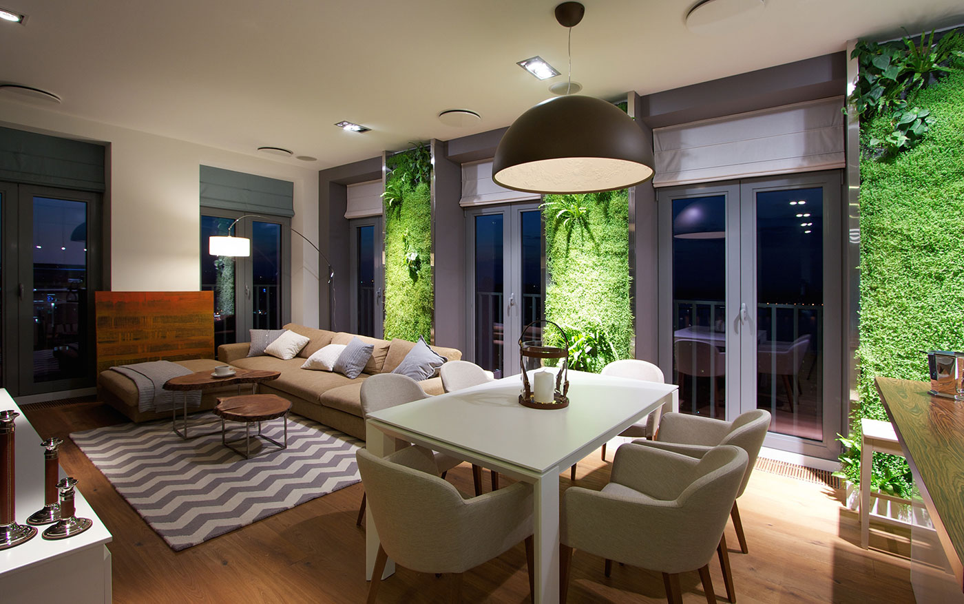 The vertical wall garden panels between the large windows provide a sense of harmony and calm.