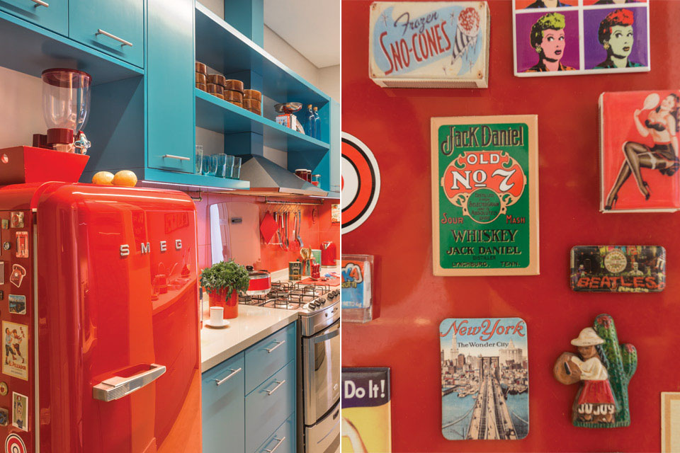 This newly redesigned kitchen with a midcentury modern look by Estudio 1425 uses vibrant colors to provide the room with a distinct personality.