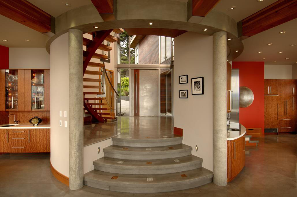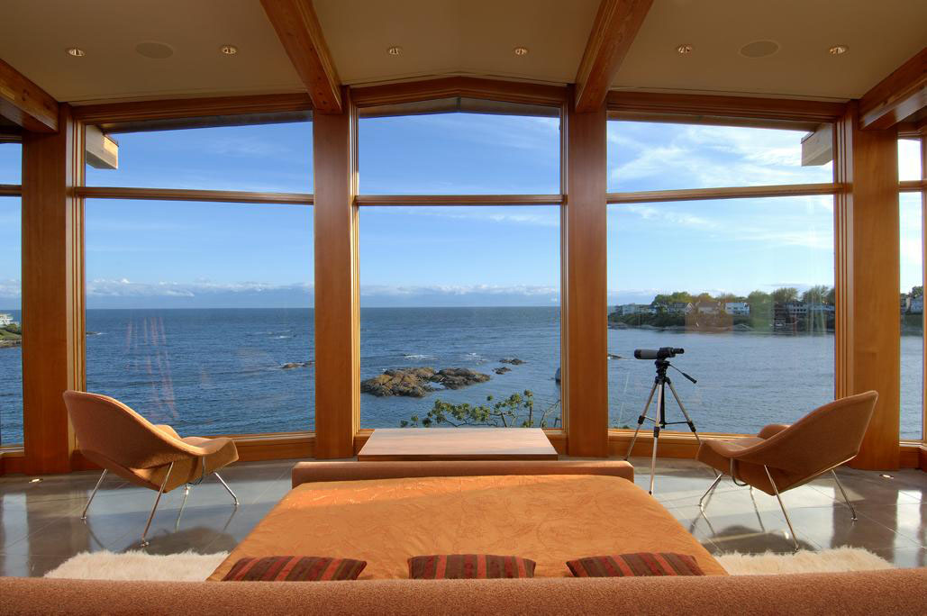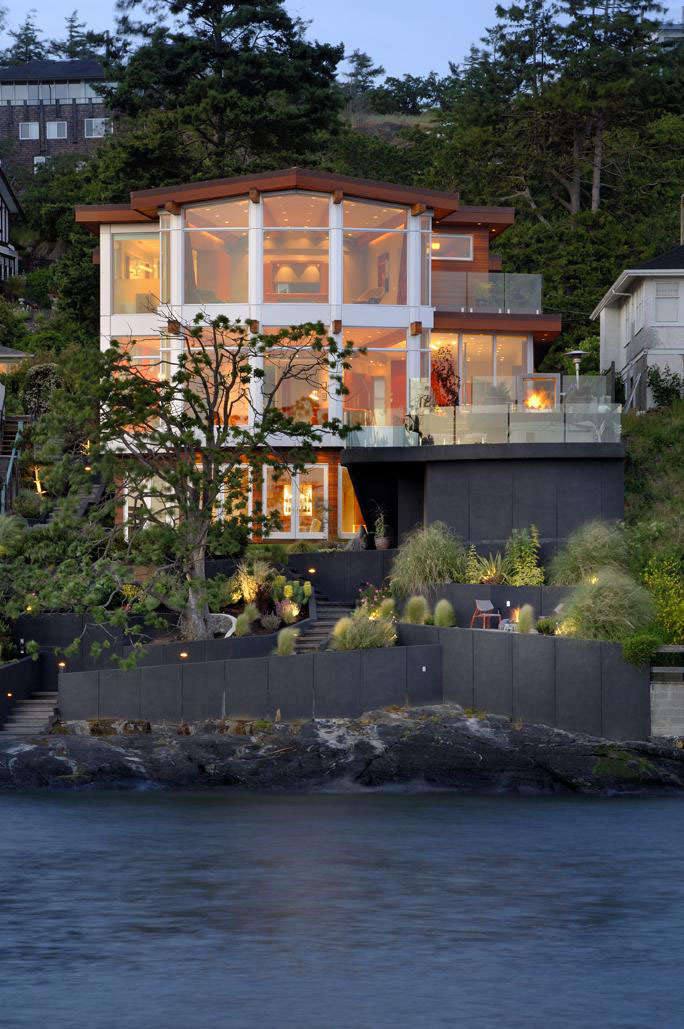 Located at 1927 Crescent Road in Gonzales Bay in Victoria, British Columbia, Canada, this award winning modern beach house incorporates steel, glass, cedar, concrete and fir into its design. The ocean side of the house has curving glass windows to take advantage of the panoramic views of the Straits of Juan de Fuca and the Olympic Mountains.