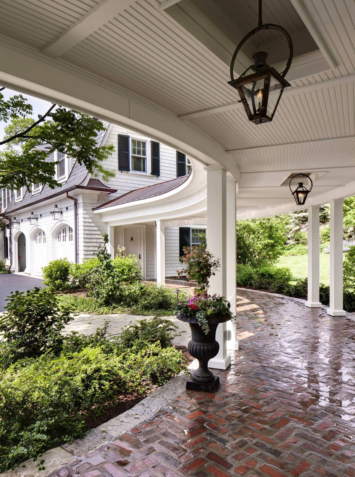 The central feature of this timeless shingle-style lake house in Lake Geneva, Wisconsin is an elongated, open concept veranda. The porch wing with views has openings on all sides.