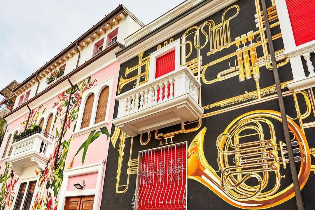 The architecture of the street is now characterized by the graphics of trumpets, flowers, roses and red lipsticks.